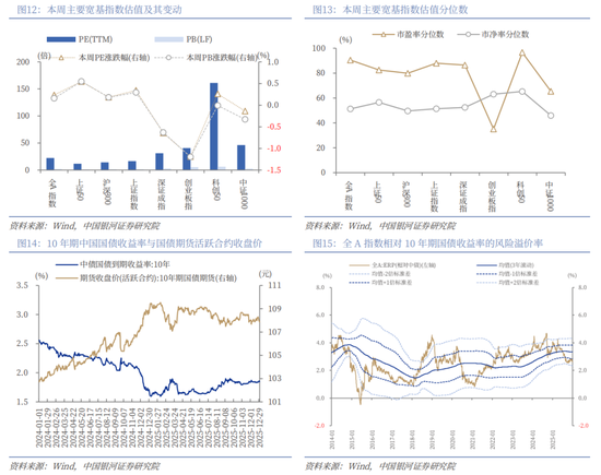 本周A股行情:(1)本周(2025年12月29日-12月31日),A股市场呈现震荡行情,全A指数下跌0.33%。上证指数上涨0.13%,北证50、创业板指跌幅靠前,跌超1%。(2)从风格来看,本周小盘风格相对占优,中证1000(-0.13%)跌幅小于沪深300(-0.59%);五大风格指数中,周期风格上涨0.65%,而稳定风格和消费风格明显回调。(3)从行业来看,一级行业涨跌分化。涨幅靠前的三个行业分别为石油石化、国防军工、传媒。公用事业、食品饮料、电力设备跌幅靠前。