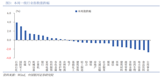 从行业来看,本周一级行业涨跌分化。涨幅靠前的三个行业分别为石油石化、国防军工、传媒,涨幅分别为3.92%、3.05%、2.13%。公用事业、食品饮料、电力设备跌幅靠前。