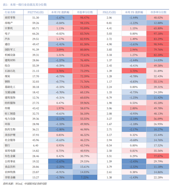 从行业层面来看,本周31个一级行业中,11个行业市盈率估值上涨。截至2025年12月31日,从市盈率估值来看,共有20个行业估值高于2010年以来50%分位数,有8个行业的估值处于2010年以来20%-50%分位数区间,另外3个行业估值低于2010年以来20%分位数水平。其中,商贸零售、房地产、计算机的PE估值分位数较高,分别处于2010年以来98.47%、98.15%、93.09%分位数水平;非银金融、农林牧渔、食品饮料的PE估值分位数较低,分别处于2010年以来7.22%、14.03%、15.61%分位数水平。