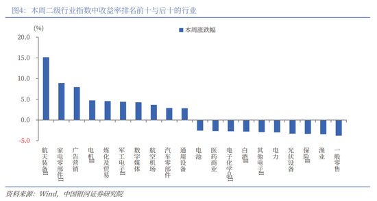 二级行业表现来看,本周收益率前五的行业依次是航天装备Ⅱ、家电零部件Ⅱ、广告营销、电机Ⅱ、炼化及贸易;收益率靠后的行业依次是一般零售、渔业、保险Ⅱ、光伏设备、电力。