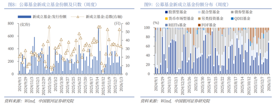 本周资金流向:(1)A股市场交投活跃度上行。本周日均成交额为21283亿元,较上周上升1631.69亿元;日均换手率为1.7386%,较上周上升0.08个百分点。(2)本周北向资金日均成交额为2285.04亿元,较上周上升460.81亿元。截至周二,两融余额为25552.81亿元,较上周上升119.80亿元。(3)本周新成立基金33只,发行份额为119.16亿份。其中,权益类基金27只,发行份额85.04亿份,本周份额占比71.37%,较上周上升22.37个百分点。